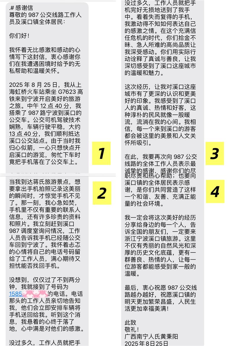 2025年8月25日,一场跨越宁波与溪口的“公交极速营救”悄然上演。来自广西南宁的游客黄先生在987路公交车上不慎遗落存有重要资料的手机,原本焦急万分的他,却在短短2分钟内体验到了宁波公运公交效率与温度并重的专业服务。