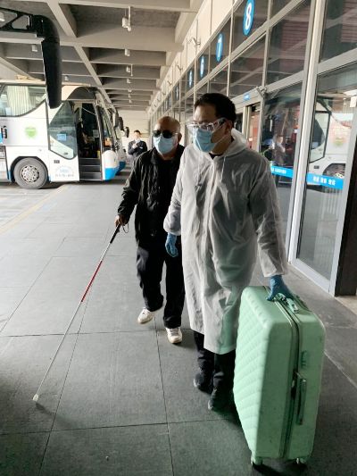 “请问您要去哪里?我来帮您吧!”方才还一筹莫展的旅客立马露出了笑脸,紧紧地拉着小泮,回答道:“谢谢你,小伙子,我刚从奉化到宁波,准备转车去舟山,因为眼睛看不见,所以不太方便,要麻烦你啦!”小泮微笑相迎,随即帮旅客买好了去舟山的车票,从购票、安检到上车,小泮为其开通了绿色通道,一路相伴,无微不至。正当时,这位旅客的口罩突然掉了下来,原来是口罩带子断了,“我就一只口罩,没口罩不能乘车,这可怎么办呢?”盲人旅客一时慌得不知所措,小泮连忙安抚并从3561服务台领了一只口罩帮旅客戴上。不善言辞的旅客一再向小泮表示感谢,并执意从口袋里掏出钱要塞给小泮,“小伙子,这钱你一定要收下,你已经帮我忙了,我怎么好意思白要了你的口罩。”小泮笑笑道:“这口罩不用钱,是我们车站送您的。疫情期间,车站专门为有特殊情况的旅客准备的,您就把钱收起来吧!我是南站3561服务班的,这有我们的联系方式,下次您来宁波,有困难可以联系我们。”小泮边说边递上了3561的服务名片。