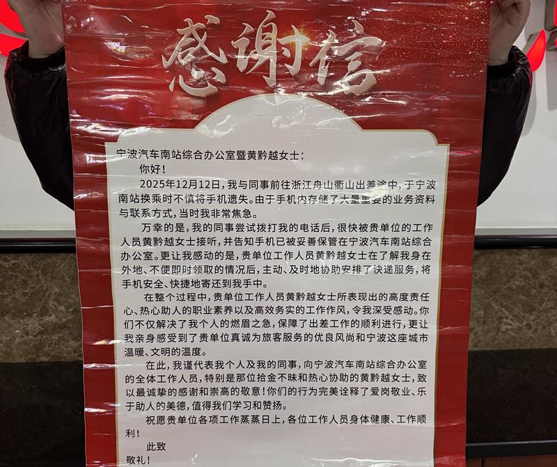一面跨越千里的锦旗背后,藏着宁波汽车南站服务台工作人员黄黔越践行“从心做起,给您满意”服务理念的温暖故事。12月11日,服务台急促的电话铃声打破了午后的平静。“您好!宁波汽车南站,请讲。”黄黔越如往常般接起电话,听筒那头传来旅客杨先生语无伦次的焦急声音:“我东西落车上了,我我我……”她立刻用平和专业的语气安抚对方情绪,迅速捕捉关键信息——一部手机遗落在刚抵达的客车座位上。