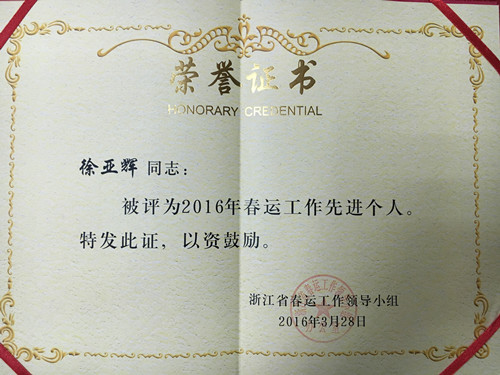 近日,宁波汽车中心站徐亚辉同志被浙江省春运工作领导小组评为2016年春运工作先进个人荣誉称号。