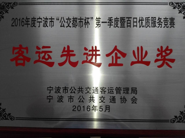 公运公交被宁波市公共交通客运管理局、宁波市公共交通协会授予“2016年度宁波市‘公交都市杯’第一季度暨百日优质服务竞赛客运先进企业奖”。
