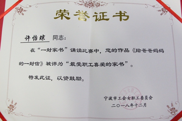 在宁波市工会女职工委员会组织的“一封家书”诵读比赛中,汽车南站许怡琼同志的作品《给爸爸妈妈的一封信》荣获“最受职工喜爱的家书”。